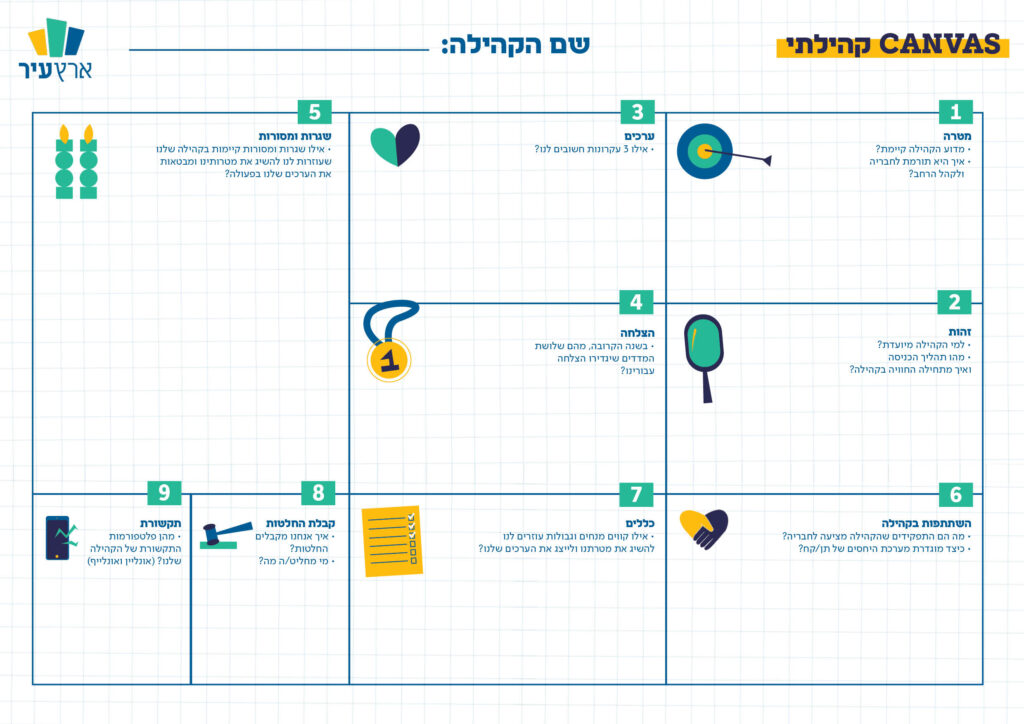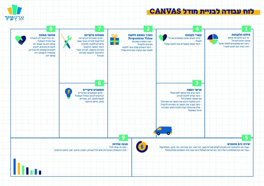 כלי ויזואלי שמסייע ליזמים חברתיים לתכנן ולמפות את המודל העסקי שלהם בצורה ברורה, ממוקדת וגמישה. מדובר בתבנית שמחלקת את המודל העסקי לתשעה מרכיבים עיקריים, כל אחד מהם עוסק בהיבט חשוב של המיזם: חברתית ושיפור איכות החיים בשכונות המתחדשות.